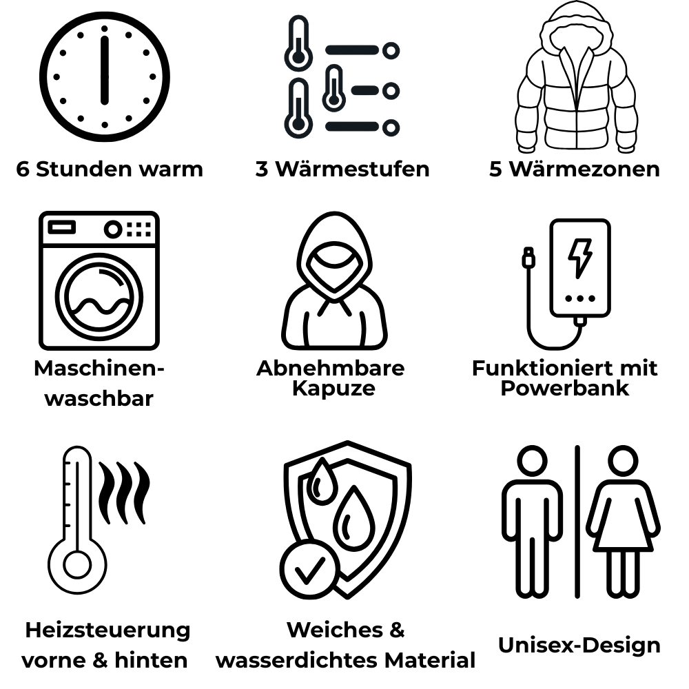 Es handelt sich um eine wasser- und winddichte Jacke mit integrierten Heizzonen, betrieben über eine Powerbank. Einfach den Knopf drücken und sofort Wärme genießen beim Wandern, Campen oder an einem frischen Morgen.